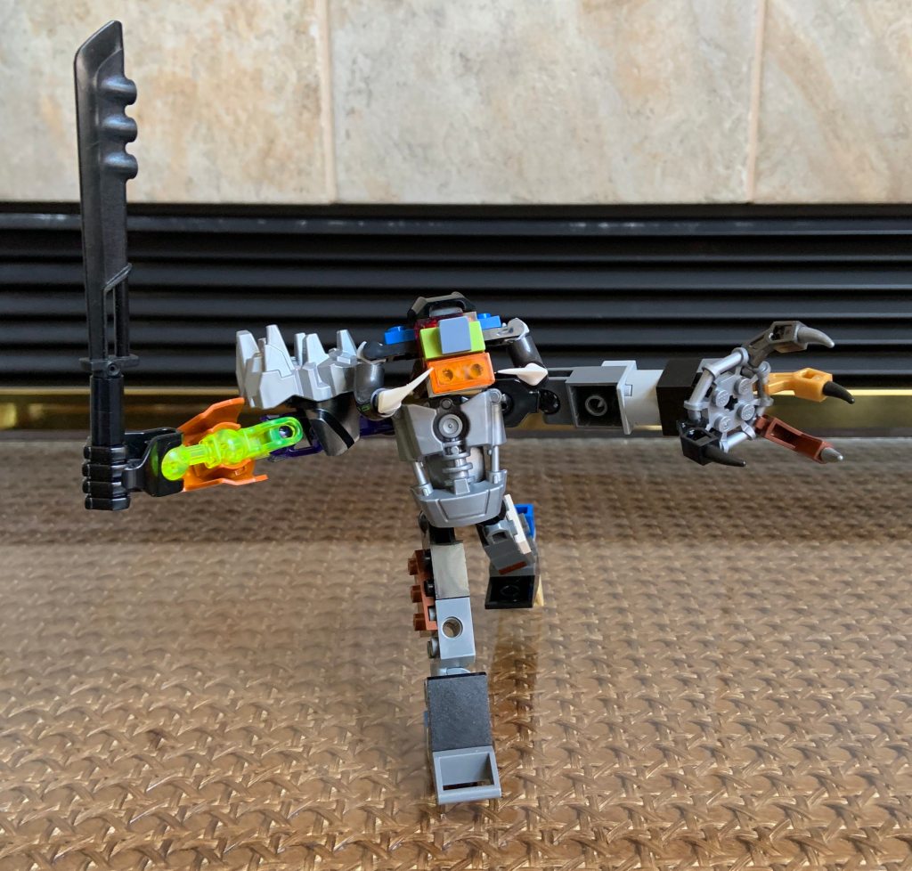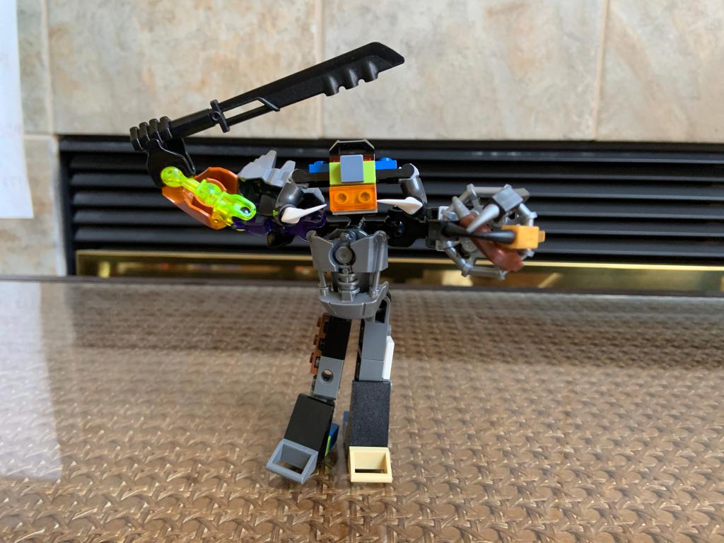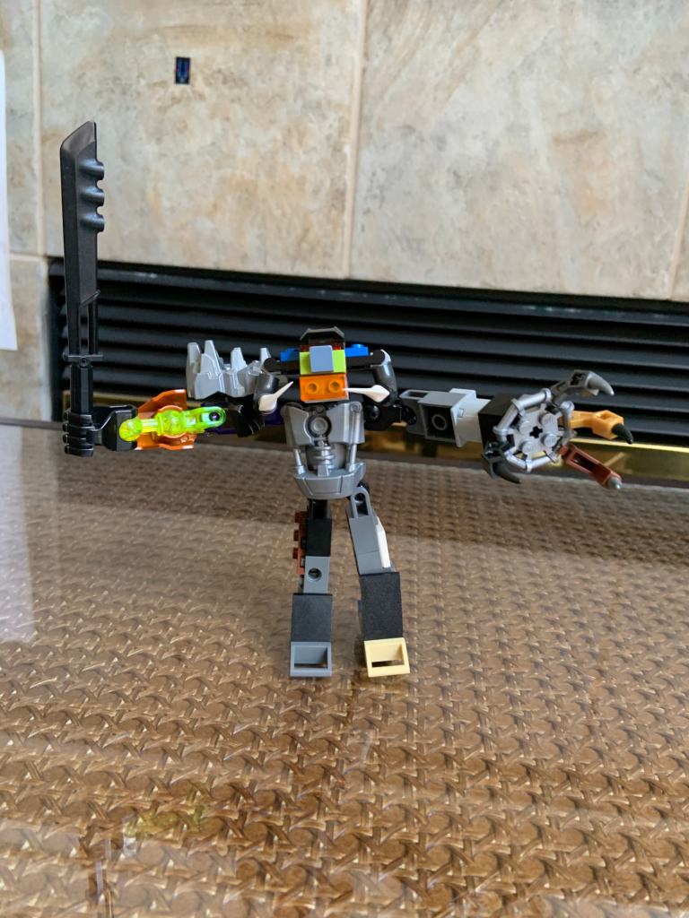 The Balrog is from the movie “Lord of The Rings: The Fellowship of the Ring”. Balrog’s are demons and appeared in the scene where the Fellowship are in the Mines of Moria and they run across this huge horned fiery whip wielding demon. You probably might know this scene because of the famous line said by Gandalf “You shall not pass!” They do not have a LEGO set on this so I made my own. The body and right arm were from a LEGO Bionicle, but I decorated them to make a cool look. In the end It features, a movable head with eyes, nose, and a mouth with side horns like in the movie, an armored body which holds all the body parts together, the left arm that has 3 points of articulation and is wielding a black sword (In the movie the Balrog wields a fire whip but I gave him a sword instead), the right arm which also has 3 points of articulation and has an openable and closable claw, and finally two legs that have 2 points of articulation. I liked this build because I do not have any LEGO sets from Lord of the Rings or from the Hobbit.