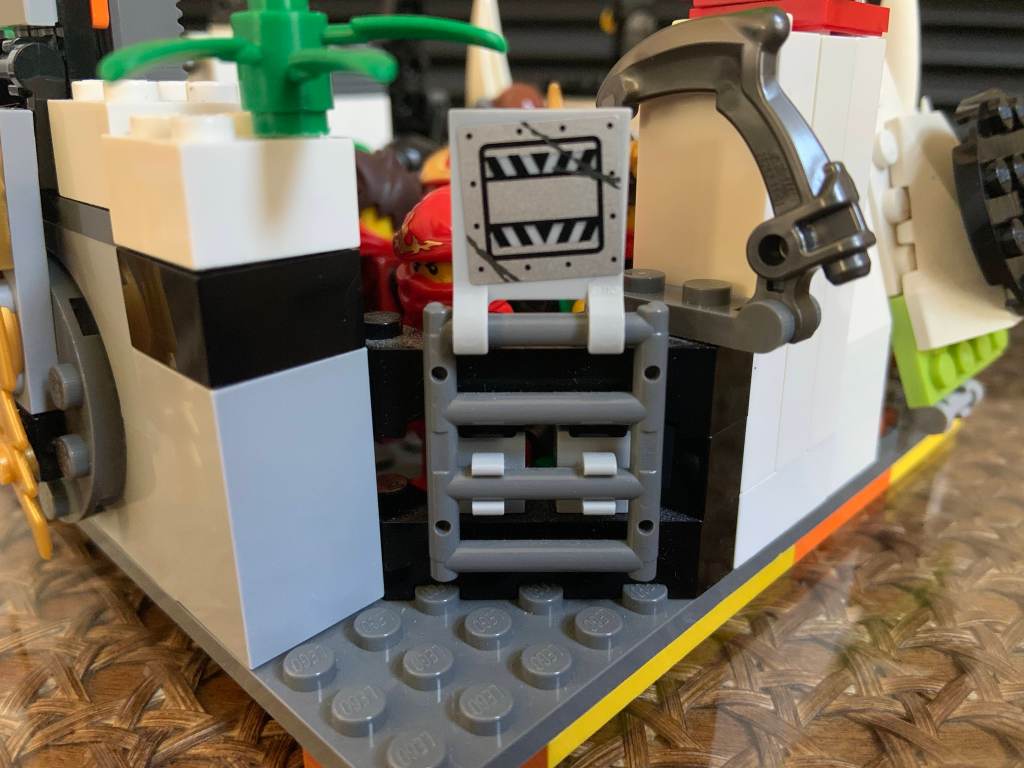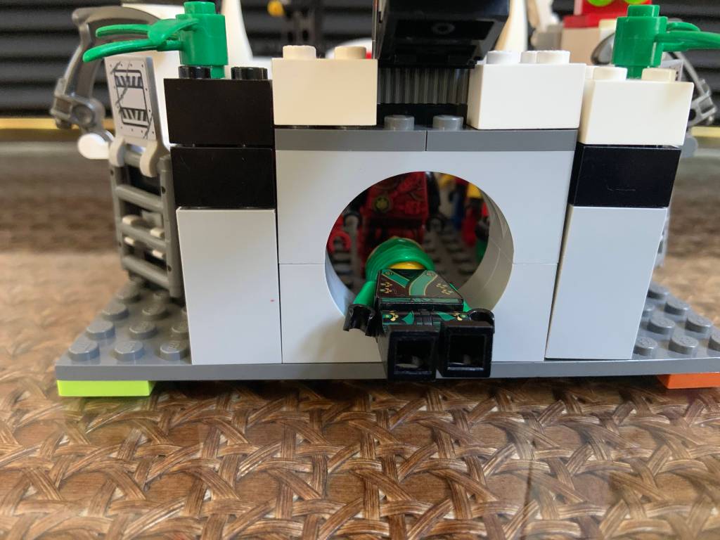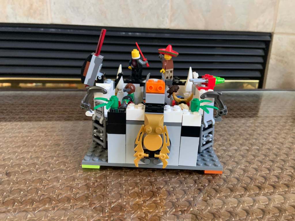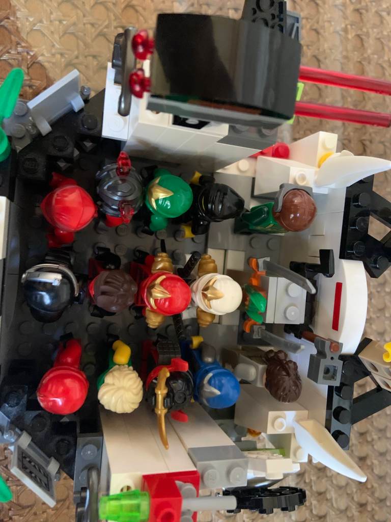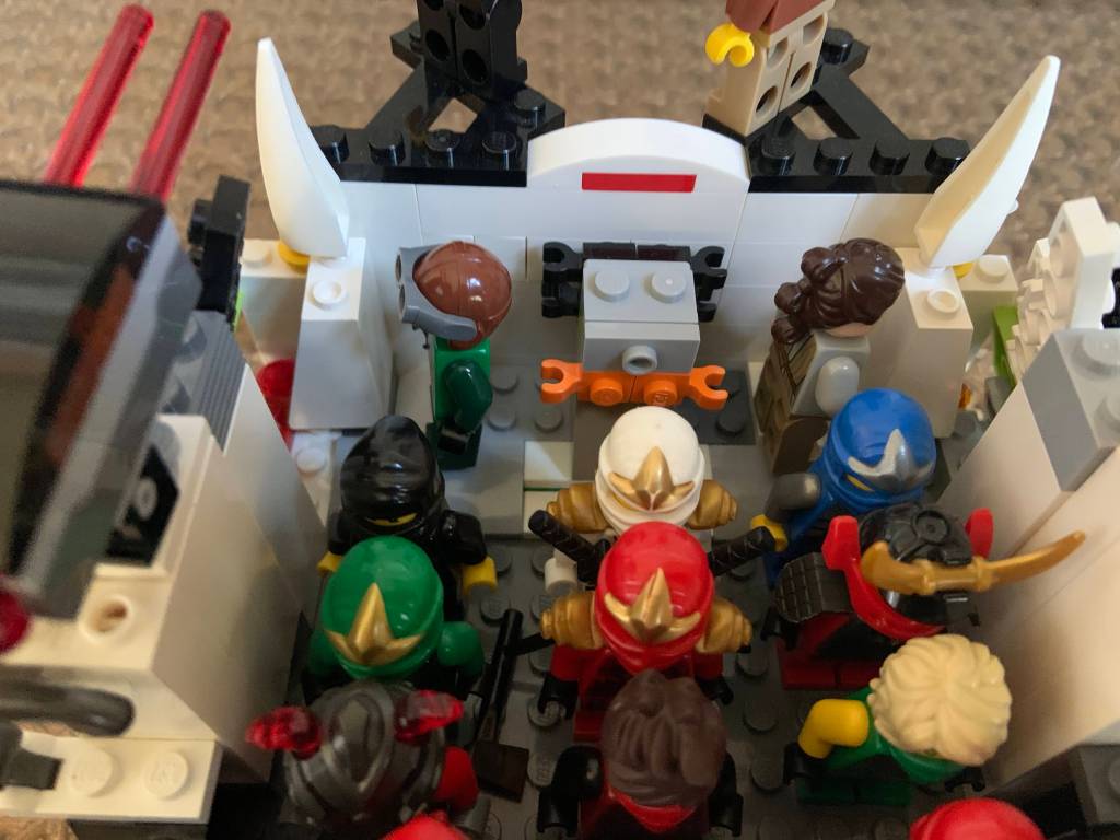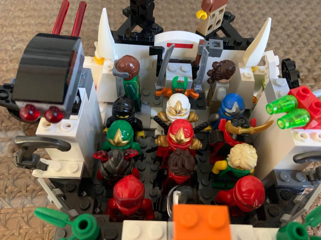 It features a cool opening circular door with gold swords on it. It opens up to reveal a circular entrance. Inside the monastery there is so much room! It can fit 8 minifigures. On the sides are swiveling two-shot cannons. one cannon has two flick-fire cannons that swivel around and the other one has a two spring-loaded shooters that swivel around and move up and down. On the sides of the Monastery it has a very sleek cool look and the two last section of the walls on either side open up like bay doors for the ninjas to go out in secret instead of the main entrance where all the villains are. In the center of the monastery there is a weapon rack with two swords that can be clipped on and clipped off the weapon rack, and there is one axe and one hammer that also can be clipped on and clipped off. then in the center of the weapon rack there is a special hand blade (in the show it is called the “time blade”) that can be taken on and off the rack. Finally in the back there is two “V” shaped hangings overhead like sentry places for the ninjas to watch if there are any enemies coming from behind. There are also spikes so if a villain tries climbing the back walls they will meet the giant spikes! This was an awesome build because it has so many play features! It’s like a cool ninja house!