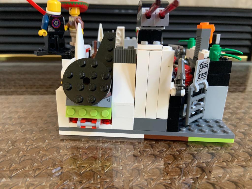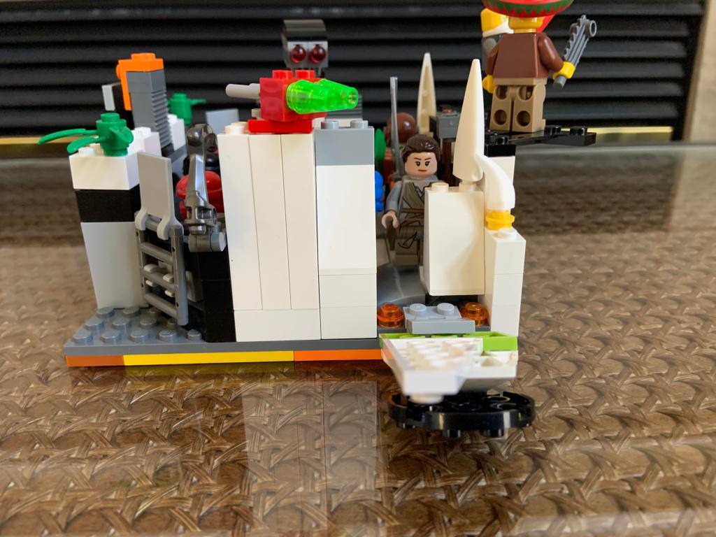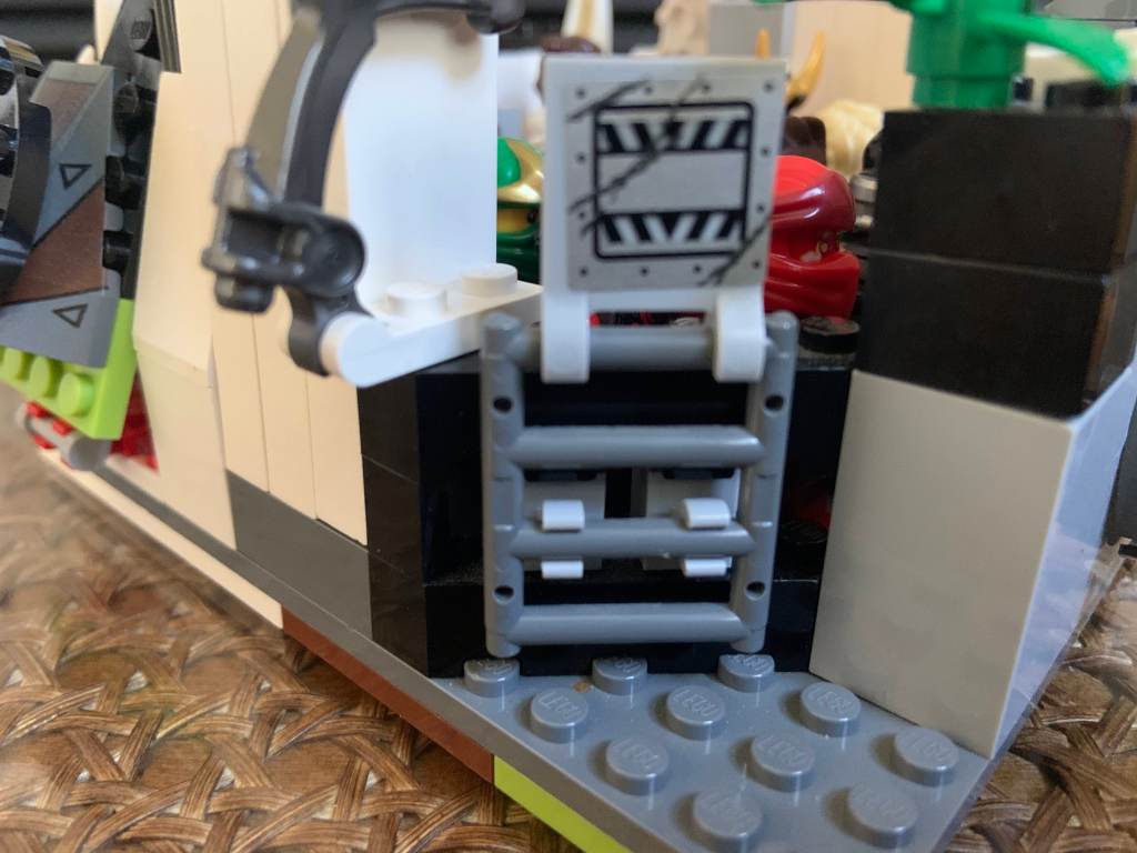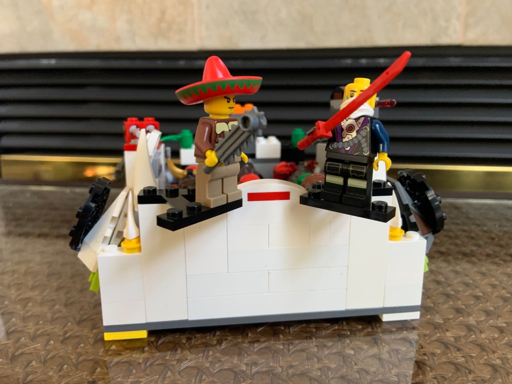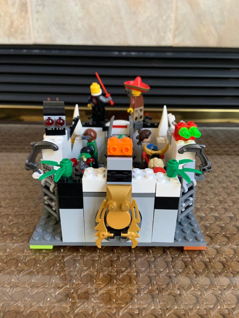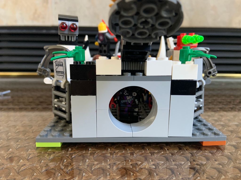 It features a cool opening circular door with gold swords on it. It opens up to reveal a circular entrance. Inside the monastery there is so much room! It can fit 8 minifigures. On the sides are swiveling two-shot cannons. one cannon has two flick-fire cannons that swivel around and the other one has a two spring-loaded shooters that swivel around and move up and down. On the sides of the Monastery it has a very sleek cool look and the two last section of the walls on either side open up like bay doors for the ninjas to go out in secret instead of the main entrance where all the villains are. In the center of the monastery there is a weapon rack with two swords that can be clipped on and clipped off the weapon rack, and there is one axe and one hammer that also can be clipped on and clipped off. then in the center of the weapon rack there is a special hand blade (in the show it is called the “time blade”) that can be taken on and off the rack. Finally in the back there is two “V” shaped hangings overhead like sentry places for the ninjas to watch if there are any enemies coming from behind. There are also spikes so if a villain tries climbing the back walls they will meet the giant spikes! This was an awesome build because it has so many play features! It’s like a cool ninja house!