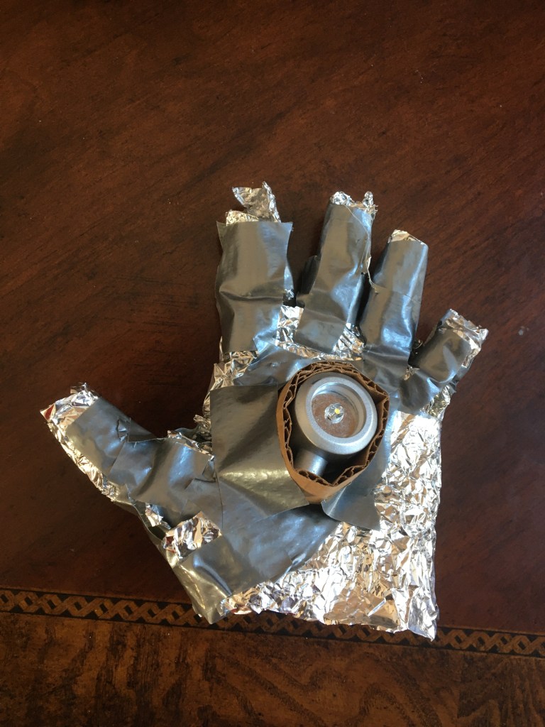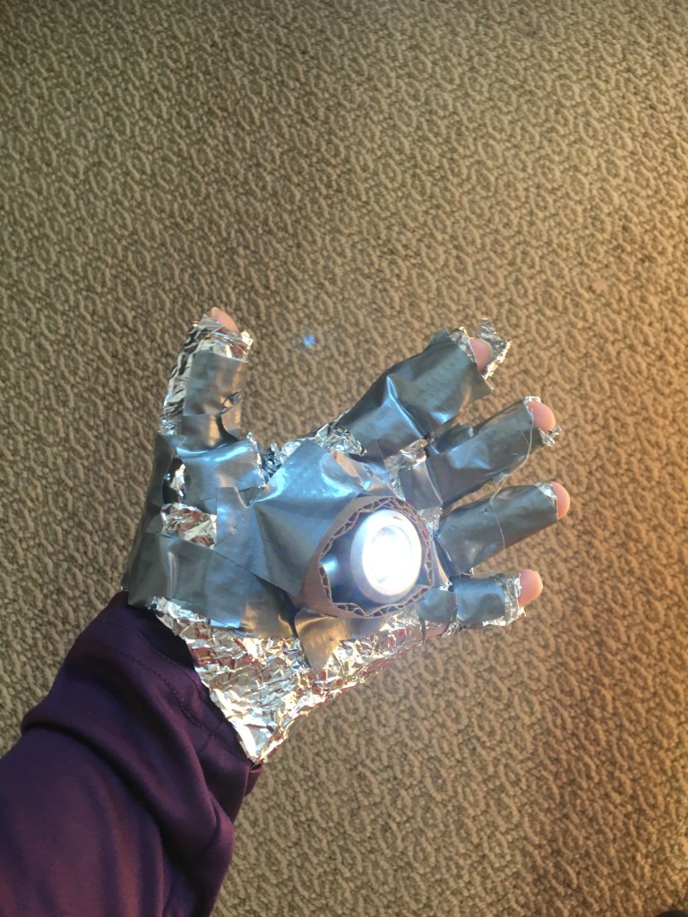 The laser hand. Or the repulsor. So I have made an Iron Man repulsor in the past but it was too simple. I simply took a red winter glove and attached a small reading lamp to the bottom and extended the light to the center in the palm of the glove. But that was too simple. And it looked really artificial and quite frankly wasn’t cool. I mean Iron Man doesn’t have a visible reading lamp attached to his hand. I only used two parts for that. So I wanted to improve it and make it look realistic. So I completely destroyed that version. I took the reading lamp only though. Since I could not find any other light the reading lamp was the best option. It was a reading lamp with a clip on the bottom and a flexible noodle thing that could move the light anywhere. The light was circular and had a metal ring around it. That circle light looked perfect for the middle light repulsor in an Iron Man glove. Just like in the movies. But I only needed the circle part alone. I didn’t need the noodle thing or the clip. Or else that would look artificial. So I had to mod and cut the noodle carefully from the circle light. Now I can easily on and off the light by pressing a button on the back. But when I put that on the glove, I won’t be able to turn the light on. Because the button will be facing the palm and the main light will be at the front. But that’s an easy fix. It’s just a matter of switching on the light differently. No modding or adding any other extensions. Just I have to press the front of the light so the button presses against the palm so it turns on easily. Now the palm I have been talking about isn’t my fleshy human palm. I’m talking about the metallic cool glove. Now this glove took a long time to make. It isn’t just like that winter glove no not at all. I used tin foil to get that metal look and I made a whole glove out of it. I had to attach each individual tin foil finger I made to the main base of the hand. The process of making the hand and fingers took 2 hours! I made many variations and changes until it was perfect. My hand slid in perfectly into the glove. I now attached the circle light (which I wrapped a strip of cardboard around to make it look a little wider so It doesn’t look so scrawny and insignificant to the width and size of the tin foil glove) to the glove and I had a fully operation Iron Man repulsor glove. With the iconic light in the middle. It was perfect. It looked exactly like the ones in the movies. My step one of the Iron Man suit was complete!